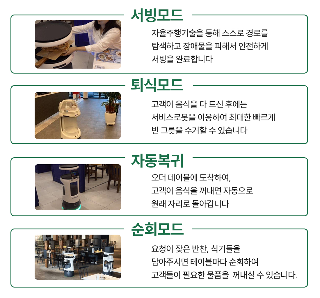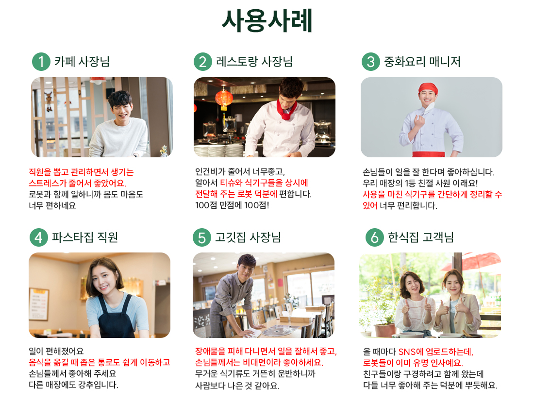 점심시간에 워낙 사람들이 많이 몰리다 보니 직원이 많이 필요한데 늘 근태 문제가 심했어요. 서빙 로봇을 도입한 후에는 퇴근할 때 충전만 시켜두고 가면 되는 게 가장 좋았어요. 서빙도 잘하고 편리하네요.