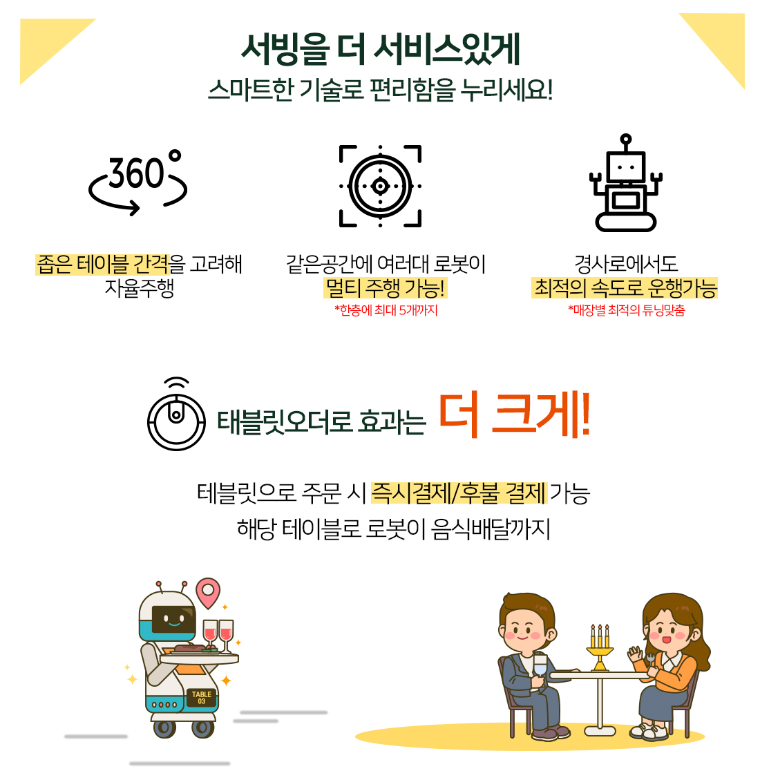 서빙 로봇과 같이 일을 시작하니 확실히 효율적이네요. 테이블 회전율도 올라가고 서빙 시간동안 다른 일에 집중할 수 있어서 좋아요. 가게를 시작하면서 지금이 가장 안정적이에요.
